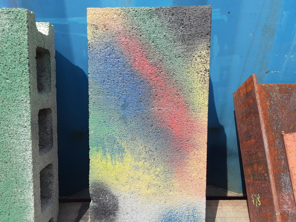 ついでにラッカーでいろんな色を重ねて塗ったブロックと、横にあった錆だらけのH鋼もレーザしてみます。
