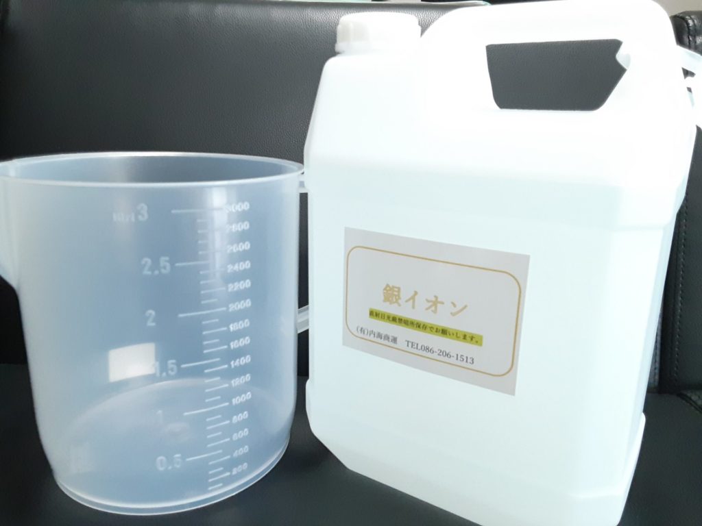 まず、4Lの銀イオン水原液 20倍希釈用(税込11,000円)と計量カップ(サービスします)を準備します。