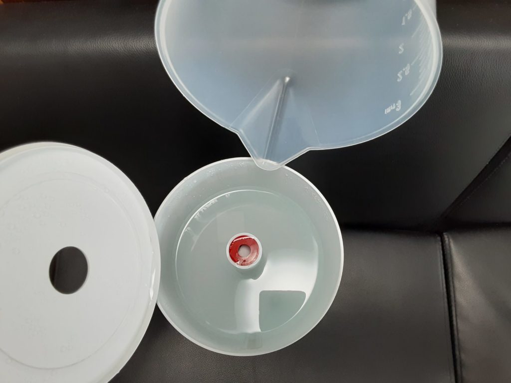 そしてそこに2Lの水をいれて後で1L足すか、一気に3L入れるかして、噴霧器に注ぎます。